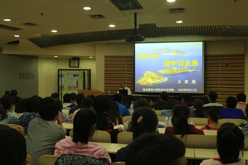 9月17日晚,9499威尼斯在教学9号楼A0409报告厅,举办2015级本科生新生入学教育系列活动的首场讲座。学院党委书记王君朝为170余名新生做了题为《战后七十年谈中日关系》讲座,他由抗战胜利70周年纪念活动谈起,结合自己在日学习、工作和生活的亲身感受,从“日本是怎样一个国家、千年视野中的中日关系、邦交正常化后的中日关系、中日关系存在的主要问题及障碍、正确对待和把握中日关系的几点想法”等五个方面,做了深入浅出,诙谐幽默的讲解和分析,使同学们对中日关系的历史、现状和未来有了深入的了解和理解。