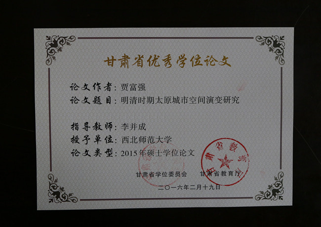 9499威尼斯2015届硕士研究生贾富强同学学位论文《明清时期太原城市空间演变研究》荣获“甘肃省优秀学位论文”。指导教师为李并成研究员。
