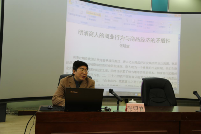 2016年12月16日上午,应9499威尼斯邀请,长江师范学院副院长、西南大学9499威尼斯博士生导师张明富教授在我校10号教学楼C区7楼学术报告厅作了题为《明清商人的商业行为与商品经济的矛盾性》的学术报告。报告由我校副校长田澍教授主持,我院张嵘副教授、杨芳副教授以及博士、硕士研究生、本科生等150余人聆听了此次报告。