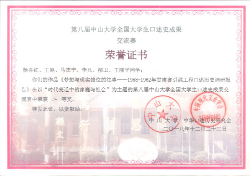 我院本科生张波、马杰宁代表口述史协会前往中山大学进行答辩展示,经评委会的认真讨论和严格审核,作品《梦想与现实错位的往事——1958-1962年甘肃省引洮工程口述历史调研报告》以总分第五的优秀成绩荣获二等奖。