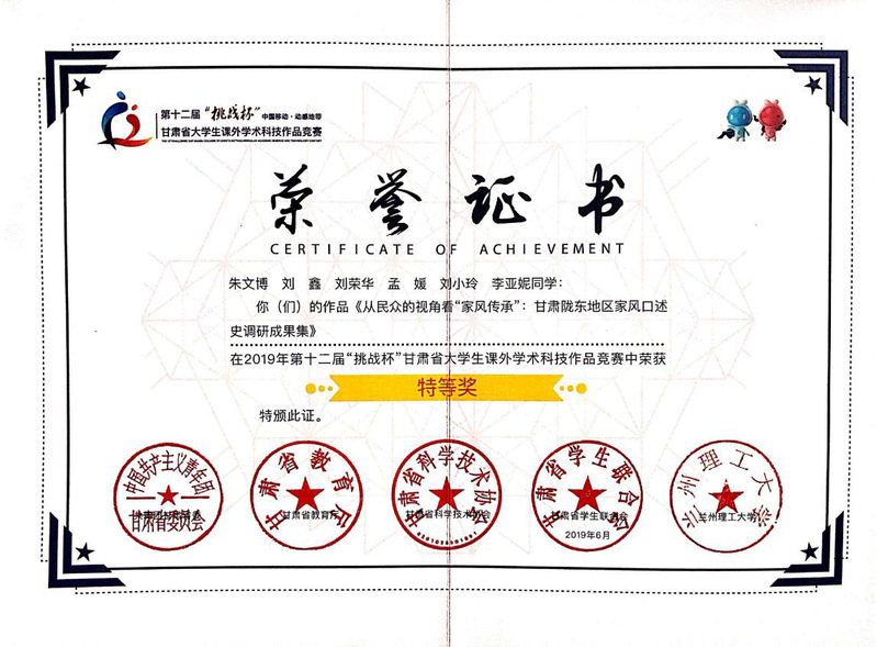6月29日,第十二届“挑战杯”甘肃省大学生课外学术科技作品竞赛终审决赛在兰州理工大学兰工坪校区举办,我校多项项目在竞赛中取得了较好的名次。其中,我院2015级本科生朱文博同学主持的项目《从民众的视角看“家风传承”:甘肃陇东地区家风口述史调研成果集》荣获特等奖,项目指导老师尚季芳教授获优秀指导教师荣誉称号。