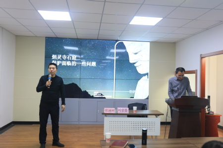 刘宗昌主任以炳灵寺日常保护监测的照片为切入点,向同学们讲述了影响石窟保护的三大因素:自然灾害、环境和生物,尤其是人所产生的影响。由此讲到了旅游开发的现状,随着旅游业的不断发展,游客承载量应该成为文物保护单位重视的问题。因为游客所产生的湿度、二氧化碳和机械损伤对文物造成酥碱、空鼓、起甲、疱疹等一系列病害问题,而这些问题很多都是不可逆的。最后刘主任将落脚点放在炳灵寺石窟的游客承载量上,向我们展示了由炳灵寺石窟自身特点所决定的游客承载量,以及炳灵寺石窟文物保护研究所采取的保护与展览并重的有效措施。最后,刘宗昌主任解答了同学们提出的问题并欢迎大家加入到炳灵寺文物保护与研究这个大集体。