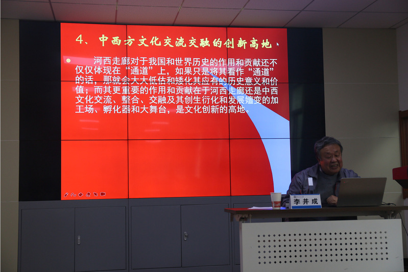 李老师讲到:在历史中,河西走廊具有重要的地位与贡献。河西走廊是中国走向世界的第一条通道,是中国最早向西开放的窗口;河西走廊是中华民族共同体赖以形成发展、共建共生的民族走廊;河西走廊是中原王朝向西伸出的“右臂”,中国西部的“命门”所系,是实现国家“大一统”的“国家走廊”;河西走廊是中西方文化交流交融的创新高地。