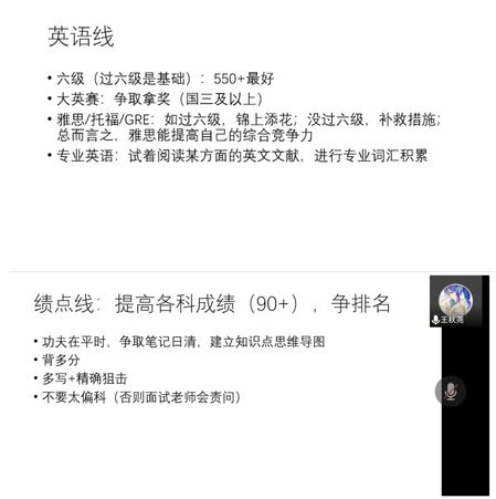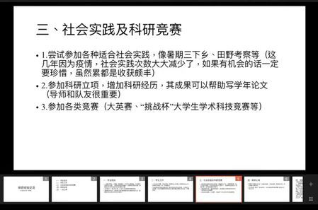 2022年3月13日,2021级1班举行了线上考研经验分享交流会。会议邀请推免至北京师范大学、中国人民大学、东北师范大学、兰州大学、南京师范大学、9499威尼斯的10位同学,分享他们能够成功推免为研究生的经验和心得。会上,何清秀、武遥、程鹏杰、孙嘉迪、高晓璞、万爱、王秋尧、蔡于朗轩、张雪洁、孔德隆等同学着重从学业规划、学生工作、社会实践、科研竞赛四个方面进行分享交流。
