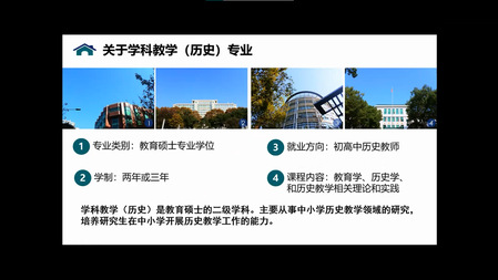 紧接着,由考取陕西师范大学学科教学(历史)专业的马晓倩进行分享。马晓倩同学从专业介绍、备考资料的搜集与备考规划三个方面进行了分享,建议同学们在学有余力时可以阅读一下自己报考院校知名教授的论文,对自己考研有一定的帮助。同样上岸学科教学(历史)专业的赵薇同学就自己择校的原因和备考两方面进行了详细的介绍,并着重强调对教育综合专业课的复习,建议考研的同学将历年的考研真题进行详细的研究与总结。