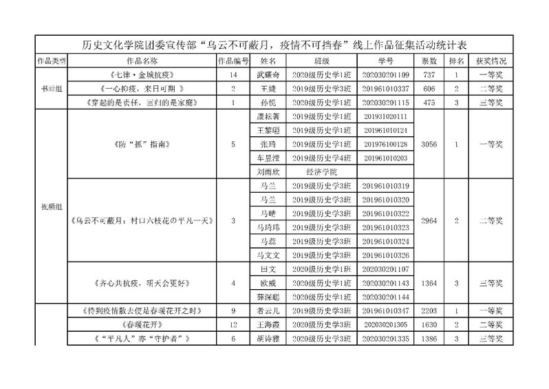 此次防疫主题线上活动受到了同学们的热情关注和参与,共14份优秀作品进入投票环节,其中摄影组8份,视频组3份,书画组3份。书法作品《七律▪金城抗疫》以诗歌为载体,赞颂全力以赴的医护人员、兢兢业业服务的志愿者、配合工作的市民等等在此次战疫中付出巨大努力的人们和这座伟大的城市,代表的是我们对战疫必胜的坚定信念。视频作品《防“抓”指南》通过三个场景展现疫情期间违反防疫规定的动作:翻墙擅自离校、不戴口罩聚集、不特通行卡出入宿舍。团队成员希望通过诙谐幽默的表演,提醒同学们不可越过防疫红线,提高疫情期间遵守学校防疫规定的意识。摄影作品《待到疫情散去,便是春暖花开之时》以鲜花代表生命力,以口罩代表疫情,希望鲜花可以冲破口罩,把春的气息带给大家,表达了学子对战疫胜利的期许。我院学生通过网络平台,认真观看了所有作品并积极开展投票工作,最终结果如下: