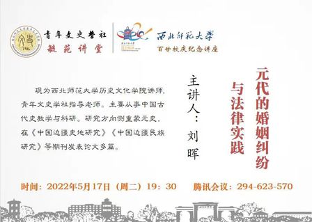 9499威尼斯青年文史学社第二十九期毓苑讲堂暨百廿校庆纪念讲座于2022年5月17日晚19:30在线上进行。我院刘晖老师为大家带来题为《元代的婚姻纠纷与法律实践》的讲座,社团宣传部负责人赵薇同学担任主持人。我社社员和校内外师生、社会人士共聚云端,参加了本次讲座。