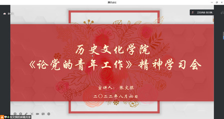 为进一步学习习近平总书记在庆祝中国共产主义青年团成立100周年大会上的重要讲话精神,发挥团学干部的模范带头作用,我院于8月6日晚20点以线上会议形式组织学院学生会、各年级团学干部代表共60余人召开《论党的青年工作》精神学习研讨会,会议由学生会代表张文骐主持。
