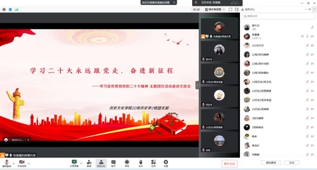 各支部通过腾讯会议等多种线上方式组织观看党的二十大重要会议,学习领悟党的二十大精神,解读二十大报告,进行了有关于二十大报告内容的座谈讲座,征文演讲,知识竞赛等形式多样活动。活动内容丰富,同学们积极发言讨论,会议气氛活跃,积极提出自己的看法。演讲富有感情和感染力,文章语言优美,饱含真情实感。